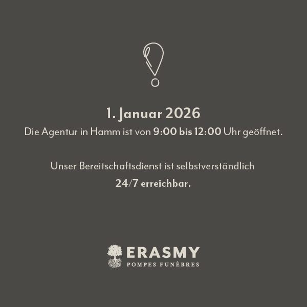 Wir bei Erasmy Pompes Funèbres wissen, dass nach dem Verlust eines geliebten Menschen, die Angehörigen oftmals ratlos zurückbleiben und es schwer ist wieder in den Alltag zurückzufinden. Jeder hat seine eigene Art und Weise mit einem Todesfall umzugehen. Uns bei Erasmy ist es ein grosses Anliegen Ihnen und Ihrer Trauergemeinschaft hier zur Seite zu stehen. Scheuen Sie nicht uns zu kontaktieren.